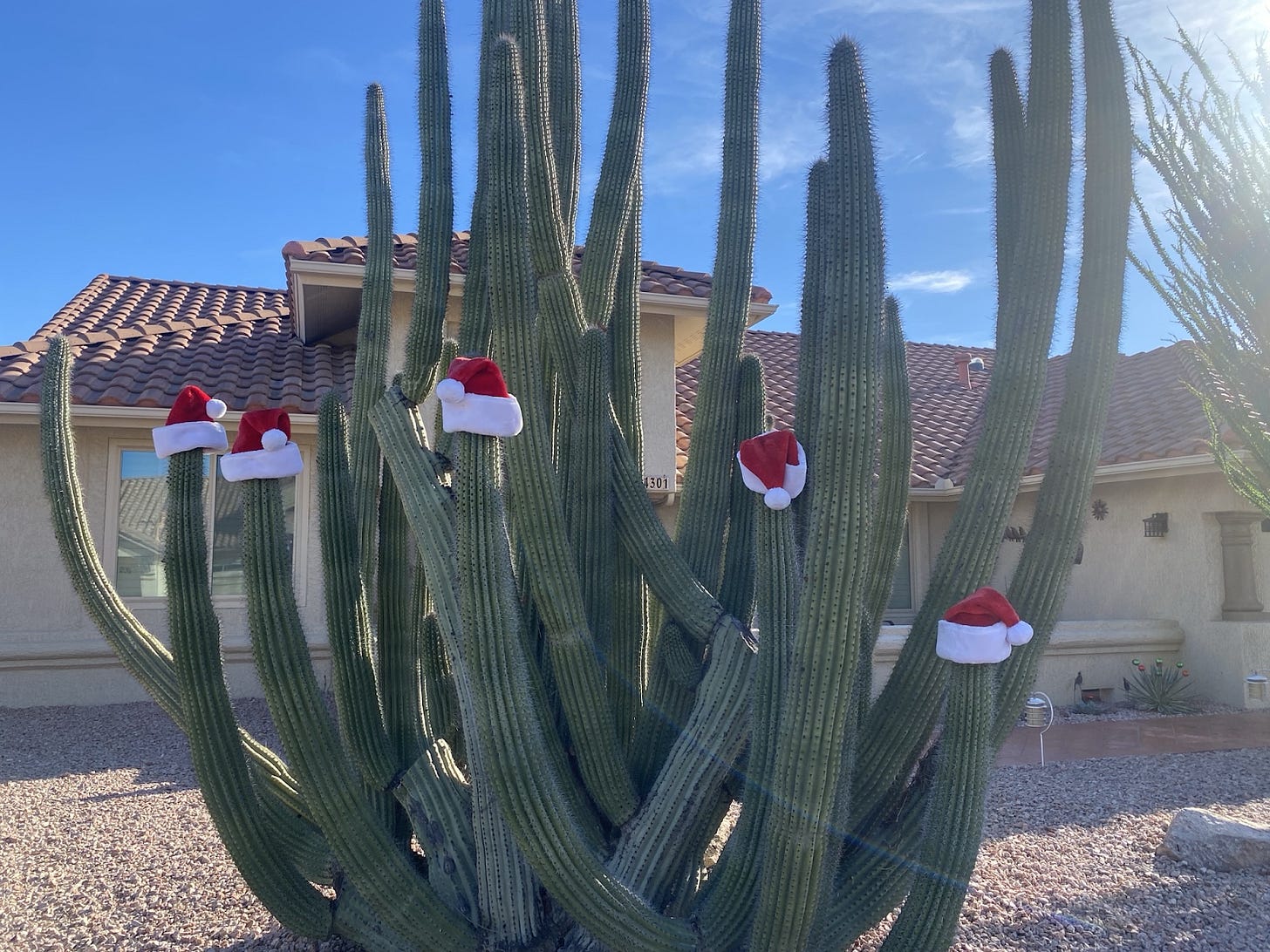 It’s been in the 80’s here in Phoenix and people have put Santa hats on their cactuses to help remind us that we live in an alternate reality when it comes to winter weather here in the desert, and I love it.