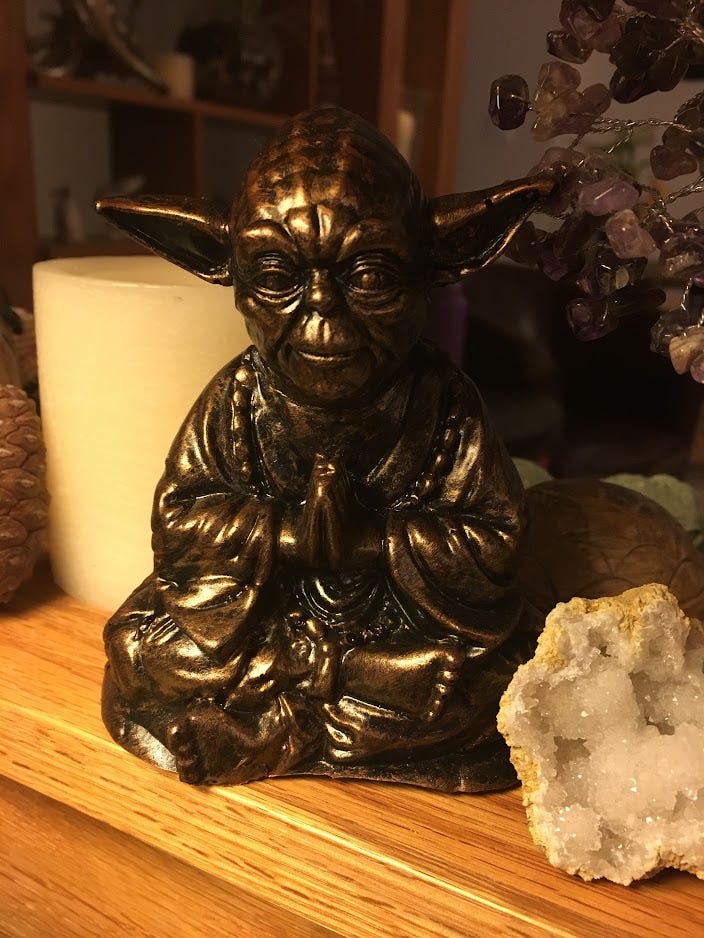 In addition to St. Francis, I also have my decks of tarot cards and a Yoda Budda nearby. Crystals and feathers, candles and pine cones. A little earthy pagan folk magic.