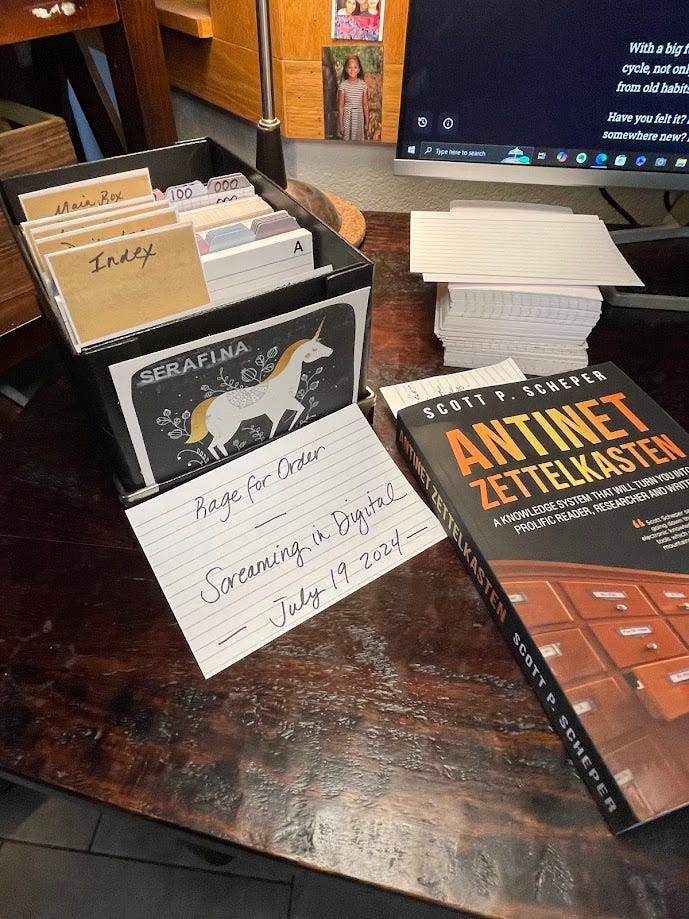 If you’ve been reading this stack for a while you know that I use note cards, and I’m a jotter. I have a couple of large piles of notes - tidbits, outlines, scraps, scenes, sources, quotes - but have been struggling to find a way to organize them in a way that will work for my writing projects, and for my life.